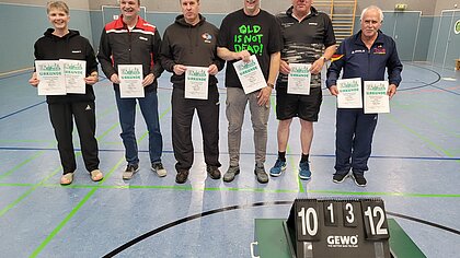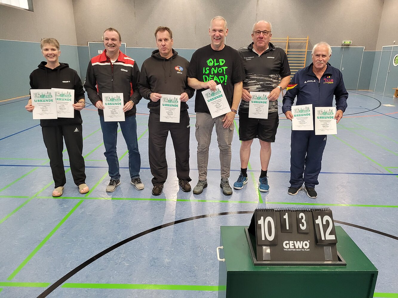 Teilnahmeberechtigt waren alle Spielerinnen und Spieler ab Jahrgang 1986 – denn laut aktueller Alterseinteilung zählen bereits 39-Jährige zur Seniorenklasse. Insgesamt fanden 26 Teil-nehmerinnen und Teilnehmer den Weg in die Halle –was für spannende Gruppenspiele in Vie-rer- und Fünfergruppen sorgte.