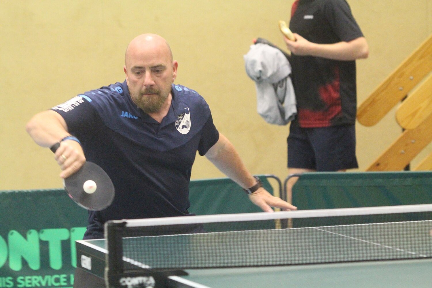 Noch personell gravierender entstand die Aufstellung bei den Hausherren. Von den Stammspielern des TSV Hittfeld III suchte man deren Namen auf dem Spielberichtsbogen vergebens. Alle TSV-Akteure dieses Pokalspiels waren Spieler der vierten Herren, die Ligapartien in der 3. Kreisklasse Ost austragen. Entsprechend mit wenigen Aussichten auf das Erreichen der 2. Pokalrunde ging es ins Play-off-Match, geprägt von einem unerwartet ausgeglichenen Spielverlauf. Die Hausherren legten mit zwei gewonnen Doppeln vor, die Eyendorfs Mats Loleit und Finn Ohlsen in den ersten beiden Einzeln wieder ausglichen. Doch der inzwischen 81jährige Linkshänder Bengt Bohnstedt brachte Hittfeld mit seinem geraden, offensiven Spiel wieder in Front. Führungen auf der einen oder anderen Seite wechselten im weiteren Verlauf des Pokalspiels. Die 5:4-Eyendorf-Führung am Ende der zweiten Einzelrunde glich Olli Allert (im Bild zu sehen) in der eigentlich letzten Partie auf dem Spielberichtsbogen wieder aus. Mit einem außergewöhnlichen letzten Zwischenergebnis von 5:5 Punkten, 17:17 Sätzen und 321:321 Bällen ging es ins Entscheidungsdoppel. Dort nahm die Pokalüberraschung seinen weiteren Verlauf. Mit einem 7:11, 11:7, 11:9, 11:6 bezwangen Christian Dithmer und Olli Allert das Eyendorf-Duo, Ohlsen/Kröger und ihr Team bejubelte den Einzug in die zweite Runde des Herren B-Pokals.