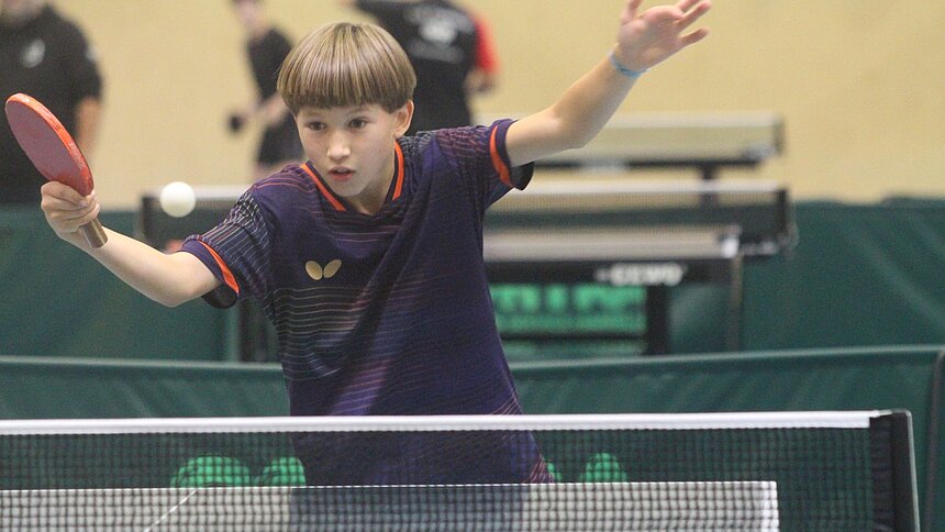 Jan-Louis Gerth begrüßte wieder als federführender Organisator viele Starter bei dieser KM, die nach 130 Teilnehmern aus dem Vorjahr mit jetzt 125 Aktiven fast unverändert blieb. In fast allen Einzelkonkurrenzen ging es nach der Gruppenphase in einem Play-Off-Feld der Hauptrunde für die beiden ersten jeder Staffel weiter. Die verbliebenen Starter freuten sich über K-o.-Spiele in der Trostrunde. In der Altersklasse (AK) 13 blieb es bei den Mädchen bei Gruppenspielen. Isabella Lommatzsch vom TSV Stelle landete ganz vorne. Auch im Mixed, erst vor zwei Jahren wieder in den Turnierablauf integriert, gewann Isabella an der Seite von Quentin Onat (SC Klecken). 23 Starter bei den Jungen 13 lieferten sich intensive Duelle, bei denen die Fleestedter die ersten Titel sicherten: Maximilian Eggers (im Bild zu sehen) und Bennet Schlotmann verloren zwar den ersten Ballwechsel im vereinsinternen Finale gegen Johnny Franz und Emil Erenyi, doch am Ende des 4. Satzes gewannen sie mit 11:5. Auch im Einzel holte Maximilian den Titel, als er seinen fünften Matchball nutzte. Gegen seinen Doppelpartner Bennet Schlotmann ging es bis zum 11:9 in Durchgang Nummer vier auf Augenhöhe zu. Nur Sekunden später entschieden die nächsten Fleestedter die Jungen-19-Doppel-Konkurrenz. Bei der erfolgreichen Titelverteidigung aus dem Vorjahr sauste der offensive Vorhandball von Emil Lüllau, der wieder mit Lasse Wübbe am Tisch agierte, diagonal über die Platte und ihre Vereinskollegen Leon Arnolda und Lennard Schlotmann waren bezwungen. Drei weitere Entscheidungen waren schon vorher beendet: Lasse Wübbe siegte mit Kleckens Paula Röse im Mixed 19. Im Mädchen-Doppel dieser AK hatten Helene von Hirschfeld (MTV Eyendorf) und Lea Sternal vom MTV Moisburg die Nase vorn. Die Einzelfinals dieser AK blieben bis zum letzten Ballwechsel hochspannend, garniert mit einer Prise Dramatik. Das Mädchen-19-Endspiel begann mit viel Ballgeschiebe. Helene von Hirschfeld wechselte zuerst in den Offensiv-Modus, gewann den ersten Durchgang gegen Evita Gosselk klar und hatte bei 10:9 im dritten die 2:1-Satzführung auf dem Schläger, die ausblieb. Im Entscheidungssatz lag sie mit 4:1 vorn, doch beim 5:4 für Evita wechselten beide die Seiten. Die 10:5-Führung der Brackelerin schmolz auf 10:8, doch den Netzroller der Eyendorferin bekam Evita noch und beim anschließenden Return sprang der Ball an die Schlägerkante von Helene und die Partie war entschieden.