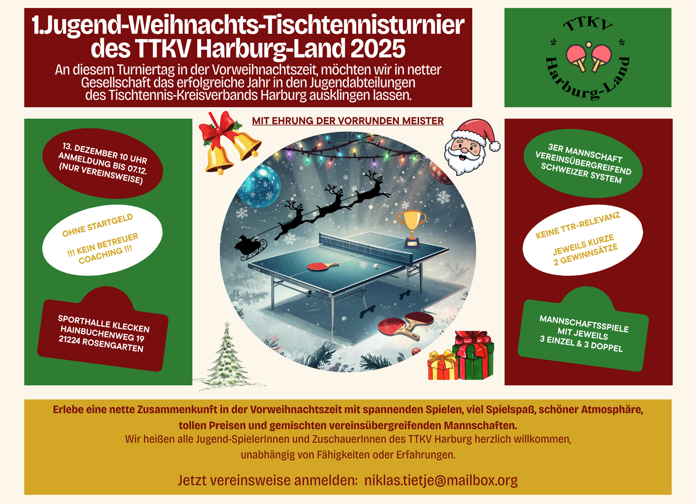 An diesem Turniertag in der Vorweihnachtszeit möchten wir in netter Gesellschaft das erfolgreiche Jahr in den Jugendabteilungen des Kreises ausklingen lassen. Daher sind auch nur SpielerInnen des TTKV Harburg startberechtigt.