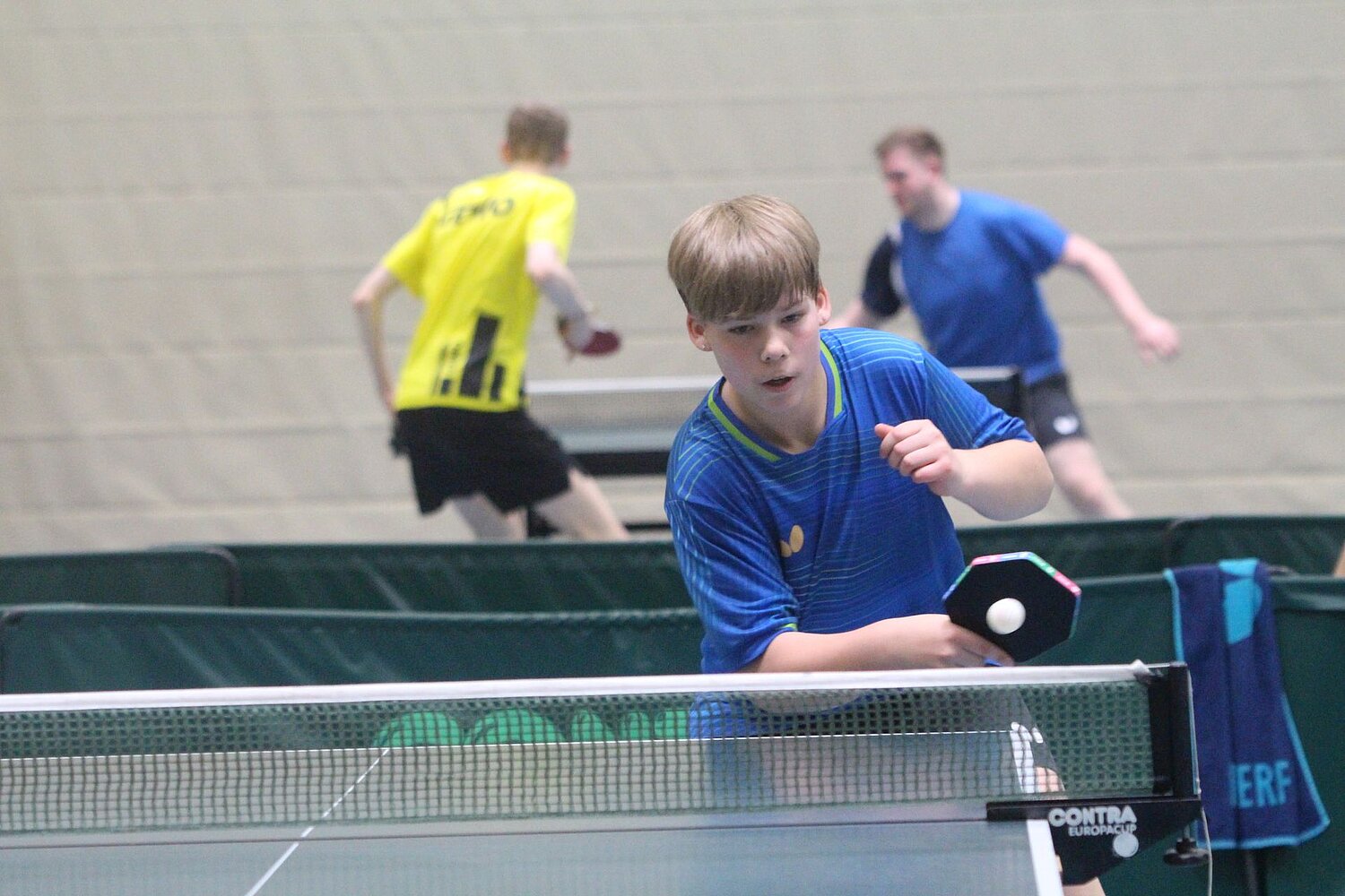 Am ersten Wettkampftag starteten die Mädchen und Jungen der AK 13 und 19. Während beim weiblichen Nachwuchs 13 keine Kreisvertreterin am Tisch stand, waren es bei den Jungen dieser AK gleich sieben: Für Majid Dzinovic, Johnny Franz und Bennet Schlotmann (alle TuS Fleestedt) gings nach der Gruppenphase mit der Trostrunde weiter. Jonathan Ruchelka (SV Dohren) und drei weitere TuS-Akteure landeten hingegen im Hauptfeld. Maximilian Eggers und Emil Erenyi erreichten die Runde der letzten Acht. Für Leon Arnolda war der Titel schon in Sichtweite. Doch im Entscheidungssatz des Finals hieß es im Match gegen Moritz Bösch aus Bremervörde 9:11 gegen ihn. Da Lukas Wotka (MTV Brackel) aufgrund seiner Bundesranglistenteilnahme in der AK 13 auf Bezirksebene nicht antreten musste und so vorab für die Landesmeisterschaften qualifiziert war, startete er in der ältesten Nachwuchsklasse, den Jungen 19. Mit zwölf Landkreis-Startern im 31er Teilnehmerfeld gingen hier auch die meisten hiesigen Nachwuchs-Asse an die Tische Das Fleestedt-Trio Lasse Wübbe, Manav Tchanra und Lennard Schlotmann und auch Brackels Gustav Steinkühler verpassten den Sprung ins Hauptfeld. Julius Wehner und Jakob Schlesselmann, ebenfalls beim TuS im Einsatz und Moisburgs Luke Sternal zogen ins Achtelfinale eine. Eine Runde weiter schaffte es Benjamin Brase (VfL Jesteburg). Fleestedts Tischtennis-Asse verteilten die vorderen Plätze fast unter sich auf. Unerwartet erreichte Lukas Wotka (im Bild zu sehen) das Halbfinale. Gegen Block- und Konterspieler Emil Lüllau war dann aber Feierabend. Am Ende gewann sein Teamkollege aus der Niedersachsenliga-Mannschaft diese AK. Bei Turnieren startete Henri Rittierott, der in der Vorschlussrunde Vitus Heins bezwang, aber für den TuS Celle.