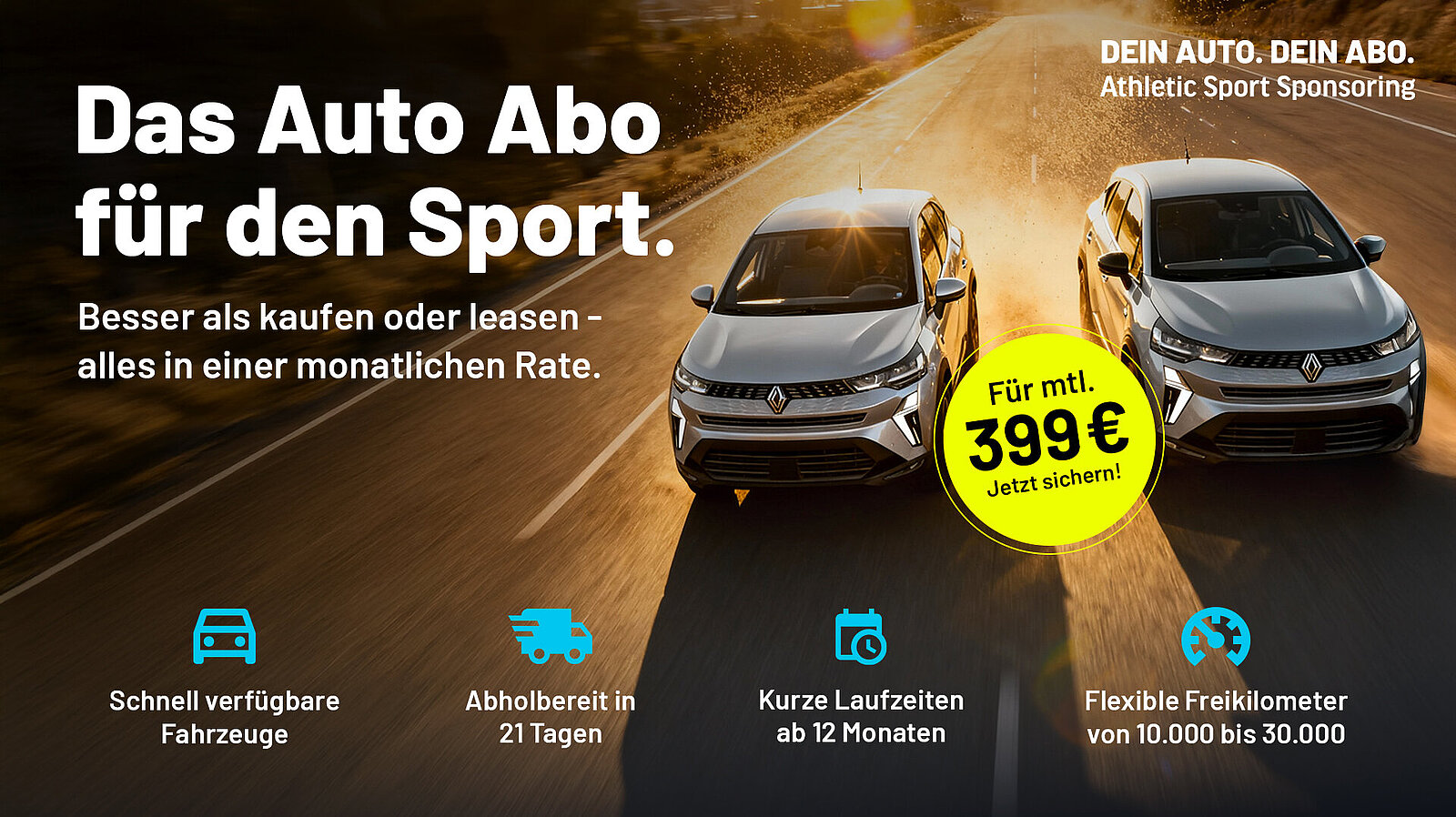 Seit 28 Jahren Partner des Sports – und heute dein Partner für neue Wege: Mit dem Renault Auto Abo holst du dir nicht einfach nur ein Auto, sondern ein Lebensgefühl.