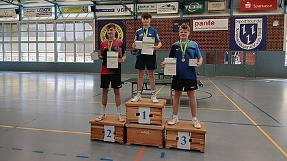 Ähnlich souverän, aber weniger überraschend, setzte sich in der Jugend 19 Konkurrenz Matthis Kassens durch. Der Celler gewann ebenfalls alle elf Spiele, verlor dabei insgesamt nur sechs Sätze. Zweimal kam der Favorit zwar fast ins Straucheln, gegen Abwehrspieler Lars Hoffschröer (Hundsmühler TV) und Jakob Sternberg (SV Arminia Hannover) fing er sich aber nach 1:2 Satzrückstand jeweils und siegte noch. Und hier schien dann auch die Einteilung der Vorrundengruppen besser zu passen: In der Endrunde landete Kassens vor dem Erstplatzierten der Gruppe B, Mathis Albers (Hundsmühler TV), der Zweite der Gruppe A, Maximilian Stüer (SV 28 Wissingen), folgte vor dem der Gruppe B, Benno Dettmer (SV Arminia Hannover).