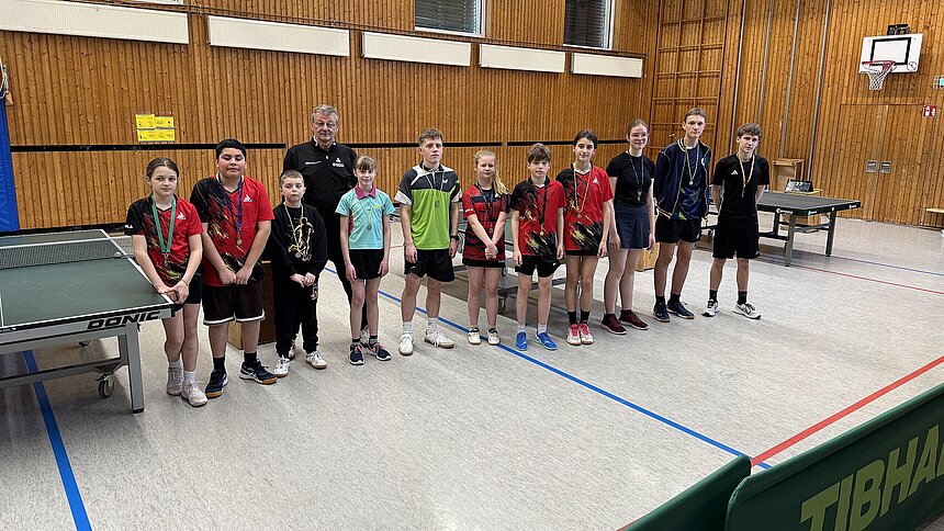 Starke Gemeinschaft: Die Teilnehmerinnen und Teilnehmer des TTVN-Kids-Race 2025/26 präsentieren sich stolz nach einem erfolgreichen Turniertag.