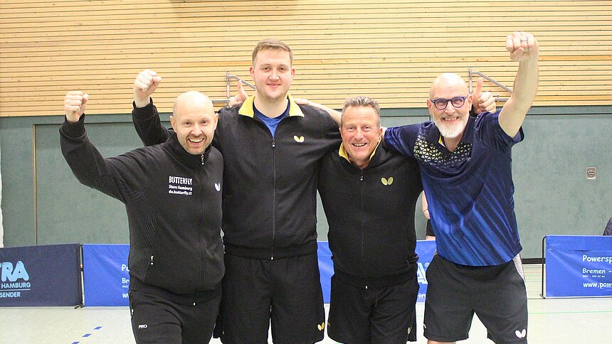 Dann ging es, nach den bekannten Pokalregelungen, los. Die Gäste des Bezirksligisten Todtglüsinger SV genossen eine 3:0-Satzvorgabe. Ein dickes Brett für die Hittfelder, die in der Landesliga Lüneburg auf Punktejagd gehen und im Bild, von links nach rechts mit Hauke Fenz, Marvin Lukas Holtfoth, Peter Pubanz und Andreas Raeder zu sehen sind.