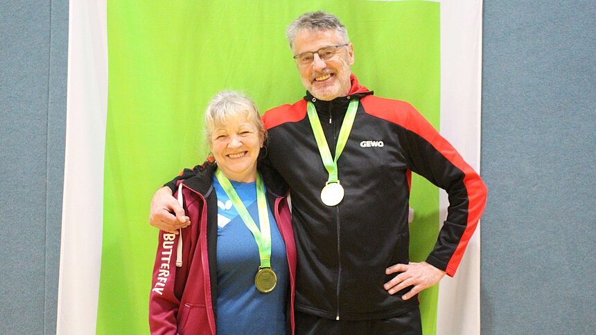 Bei ihrem zweiten Start bei den Damen der SK 70 sammelte Johanna Niepel (TSC Steinbeck-Meilsen), im Bild links mit Michael Itzen zu sehen genau die gleichen Medaillen ein, wie im Vorjahr. Einen Titel im Mixed und jeweils Silber im Einzel und Doppel. Das gemischte Doppel gewann sie dabei am ersten Wettkampftag: Niepel, die im Seniorenbereich aber für den VfL Sittensen startete, und Michael Itzen (TV Sottrum) blieben das Maß aller Dinge in diesem Wettbewerb. Gegen das Geschwister-Duo, Freia und Rüdiger Runge (beide TSV Lunestedt) münzten sie das 2:6 im ersten Satz zum 15:13 um. Nach der 2:1-Satzführung hieß es zwischendurch in Durchgang Nummer vier 5:2 und am Ende 11:9. Die Itzen-Rückhand blieb die „Lebensversicherung“ in dieser Partie. Johanna Niepel platzierte den Matchball optimal und Freia Runge setzte den Return ins Netz. Silber im Doppel sicherte die erfolgreich Kreisvertreterin, wie schon im Vorjahr mit Jutta Poludniok (TTC Waddens). Im Einzel blieb während der Gruppenphase keine Partie liegen. Auch Beate Wangenheim (TV Falkenberg) ließ sie im Vorschlussrundenmatch hinter sich. Begegnungen gegen Freia Runge gab es in der Vergangenheit schon öfter. Diesmal reichte es im Endspiel nicht. Johanna Niepel war, nicht zum ersten Mal, die erfolgreichste Starterin aus dem Tischtennis Kreisverband Harburg-Land bei diesen Landesmeisterschaften.