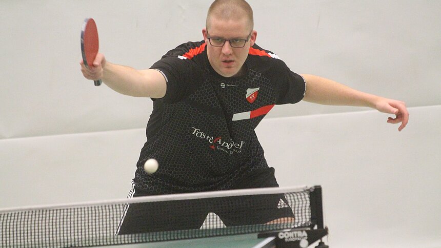 Hittfelds Bester, Daniel Bruns, führte nach 1:1-Sätzen mit 3:0 im dritten gegen Jan Louis Gerth (im Bild zu sehen), als dieser mit Time Out unterbrach. Den Satzgewinn des Hittfelders verhinderte er damit nicht, doch im fünften führte der Todtglüsinger bei Seitenwechsel mit 5:1. Die Bruns-Auszeit bei 7:3-Führung seines Gegenübers verhinderte die Niederlage nicht beim ausgepowerten und auch etwas angeschlagenen Hittfeld-Leader. Zeitgleich endete auch die Partie am Nebentisch, einem Einzel, bei dem nichts fehlte. Hittfelds Patrick Liebers führte gegen Todtglüsingens Finn Tiedemann mit 2:0-Sätzen. Bei 8:9 im dritten Durchgang fehlten nur noch drei Bälle zum Sieg. Doch die Auszeit des Top-Akteurs der Gäste änderte alles. Bälle aus der Habdistanz mit viel Energie oder der trockene Block am Tisch – die „Todtglüsinger Wand“ blieb gnadenlos bis zum Matchball, der im Tischeck auf der Rückhandseite des Hittfelders landete. Auch die Einzel im unteren Paarkreuz blieben unterhaltsam, technisch und taktisch anspruchsvoll, begleitet von dem einen oder anderen kurzen, emotionalen Gefühlsausbruch. Marcel Hiller, meist an der Hallentrennwand oder Boxbegrenzung zu finden, brachte die Kugel öfter mit Bogenbällen zurück auf den Tisch. Doch der letzte Return fand nicht den Weg über das Netz und Gerhard Petruschat brachte sein Team so mit 4:1 in Front. Parallel lief vielleicht das beste Match des Abends. Hittfeld-Oldie Holger Mengel drehte seinen Schläger fast bei jedem Ballwechsel. So kamen die Returns des 70jährigen mal mit dem Antibelag, mit geringer Geschwindigkeit oder mit satter Power auf der anderen Seite des Spielgerätes zurück auf den Tisch. Ein Aufschlagfehler Fabian Schrötkes führte zum 2:2-Satzausgleich für den Hittfelder. Auch bei 5:4-Führung Schrötkes bei Seitenwechsel im fünften war weiter alles offen. Dann zog der Gäste-Akteur davon. Den Schrötke-Netzball bekam Mengel noch. Den anschließenden Schmetterball zum Spielgewinn des Todtglüsinger aber nicht mehr. Finn Tiedemann vollendete im nächsten Einzel zum 6:1-Endstand. Beim Matchball flog der Daniel-Bruns-Rückhandball über den Tisch und der Todtglüsinger SV erreichte damit als erstes Team des Herren-A-Pokals das Halbfinale als Titelverteidiger dieses Wettbewerbs.