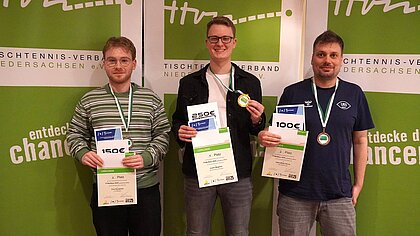 Gutes Auge bei der Ballverteilung am Tisch, begleitet von technisch sauberen Topspins – bei seiner vierten Teilnahme beim TTVN-Race-Finale 2025 stand Justin Wegener am Ende der siebten Runde auf dem obersten Podestplatz. Der 27jährige Akteur von der SG Bomlitz-Lönsheide (Heidekreis) blieb bei seiner 6:1-Bilanz auf Grund der besseren Buchholz-Zahl knapp vor dem Meppener Finn Gumprich, der bei gleichem Spielverhältnis Platz zwei belegte.