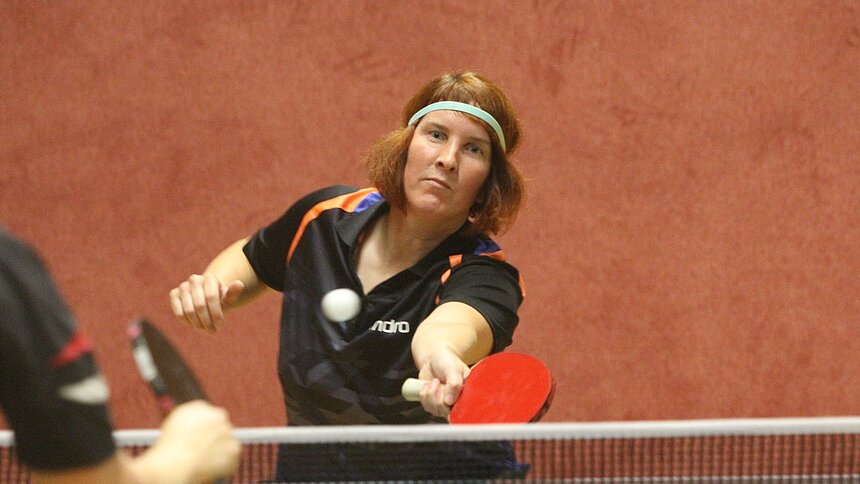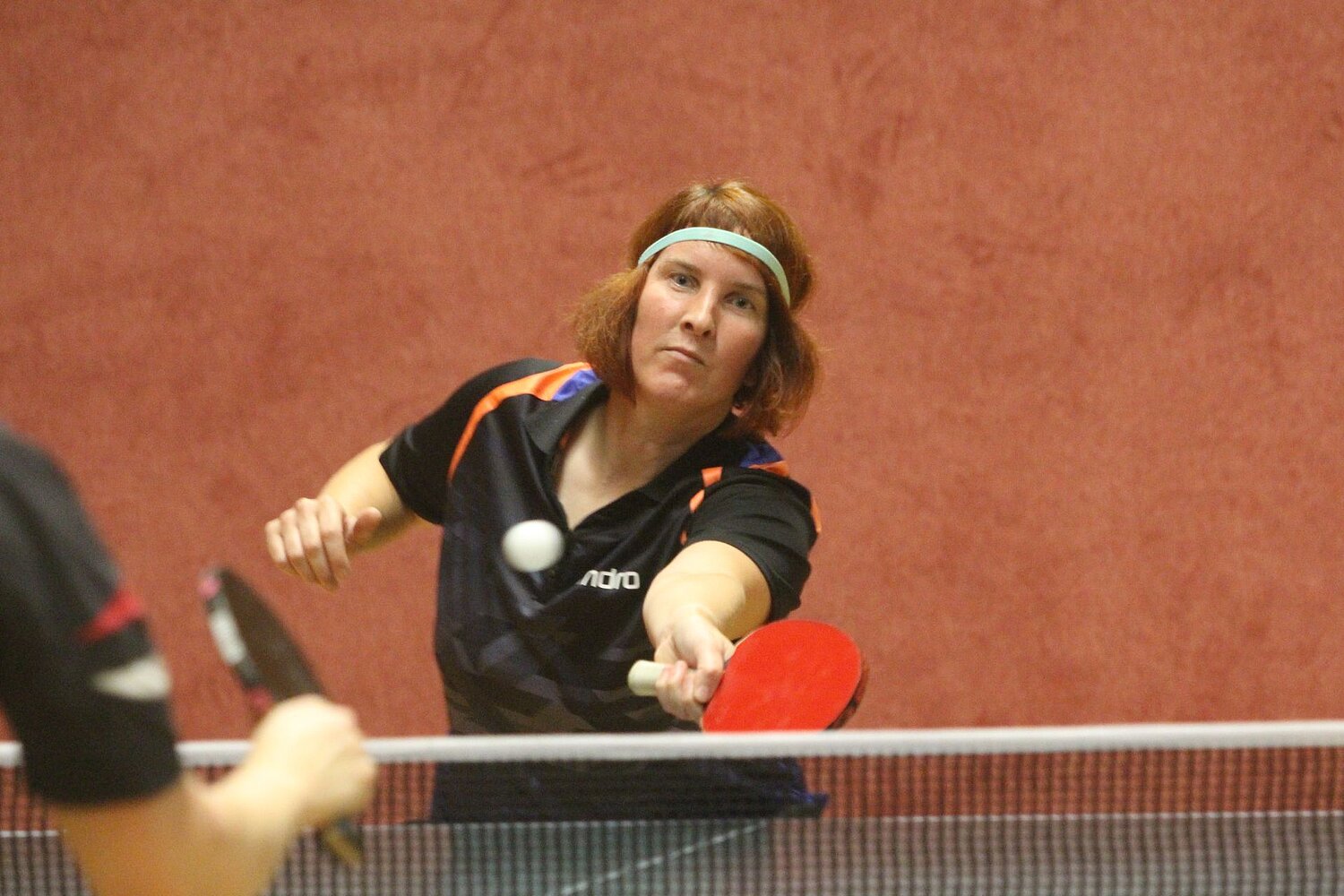 Jetzt trafen beide Landkreis-Teams im direkten Duell im Dorfgemeinschaftshaus in Vierhöfen aufeinander. Mit zwei glatten Drei-Satz-Siegen hüben wie drüben startete das Punktspiel. Die Vierhöfen-Führung von Stegemann/Köhn glichen die Gäste-Frauen, Morche und Pfaffenbach wieder aus. Abwechselnde Einzelsiege durchzogen die Partie im Anschluss und so blieb der Ligavergleich offen, bis zum letzten Ballwechsel. Stefanie Köhn (im Bild zu sehen) brachte Vierhöfen wieder nach vorn, auch Britta Stegemann lag gegen Marxens Top-Akteurin, Gerlinde Morche, gut im Rennen: Ein munterer Auftakt in den 3. Satz mit voller Offensive, einem „No-Look-Ball“ von Gerlinde Morche, als sie mit dem Rücken zum Tisch die Kugel übers Netz, aber nicht auf den Tisch beförderte und einem gerade noch zu sehenden Kantenball von Britta Stegemann bescherten ihr die 4:0-Führung, den daraus resultierenden Satzgewinn und die damit verbundene 2:1-Führung. Es ging bis in den Entscheidungssatz. Dort führte Gerlinde Morche bei Seitenwechsel mit 5:4 und zog dann davon. Beim Matchball für die Marxenerin schob Stegemann den Ball rechts neben den Tisch. Auch im Parallelspiel ging es über die volle Distanz. Schupfduelle zwischen Vierhöfens Kristiane Heuser und Christina Baumann wurden von einigen Angriffsbällen unterbrochen. Nach dem Heuser-Vorhandknaller zum 5:3 für sie, wechselten die Kontrahentinnen die Seiten. Beim Matchball für die SG-Spielerin flog der Baumann-Return zunächst Richtung Hallendecke und landete dann neben dem Tisch – 3:2 für Vierhöfen. Zwei Einzel später führten die Gäste-Damen mit 4:3. Britta Stegemann stellte die Partie wieder auf Remis. Doch nach der Kristiane-Heuser-Niederlage gegen Heidi Pfaffenbach, die sie mit einem „gegen die kann ich nicht spielen“ bewertete, schien das Heimspiel doch verloren zu gehen. Im Abschluss-Einzel rettete Heike Khoury, die verletzungsbedingt lange nicht spielte, das 5:5-Remis. Bei Offensiv-Aktionen von Christina Baumann hielt sie auch in Bedrängnis dagegen. Nach ihrem Vier-Satz-Sieg blieb der Blick auf das Satzverhältnis bei 19:19 ebenfalls ausgeglichen und die Punkteteilung spiegelt auch das Kräfteverhältnis beider Teams wider.