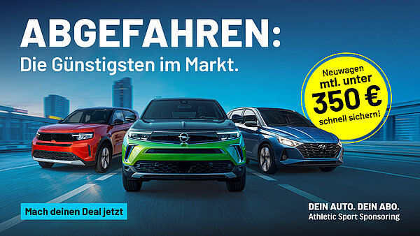 (ANZEIGE) Der Sommer geht in die Endrunde; die Preise bei unserem Partner Athletic Sport Sponsoring schmelzen dahin – aber nur, solange der Vorrat reicht! Sei also schnell, wenn du einen Neuwagen unter 350 € monatlich im sorgenfreien Auto-Abo fahren willst.